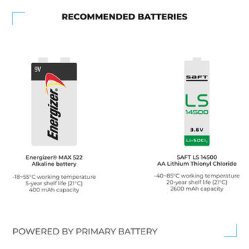 | Power Supply | Primary batteries 01 x AA size 3.6VDC for LoRaWAN and 9V for valve control (battery not included). For version with RS485 port: 2 x AA 3.6V batteries |